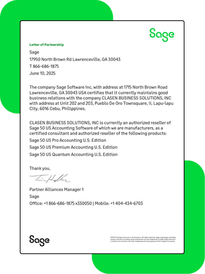 OFFICE: +63 32 266-9215 | +63 32 487-0985 MOBILE: +63 991 719 7959 EMAIL: sales@clasenbiz.com WEBSITES: www.sage50ph.net | clasenbiz.com